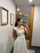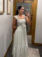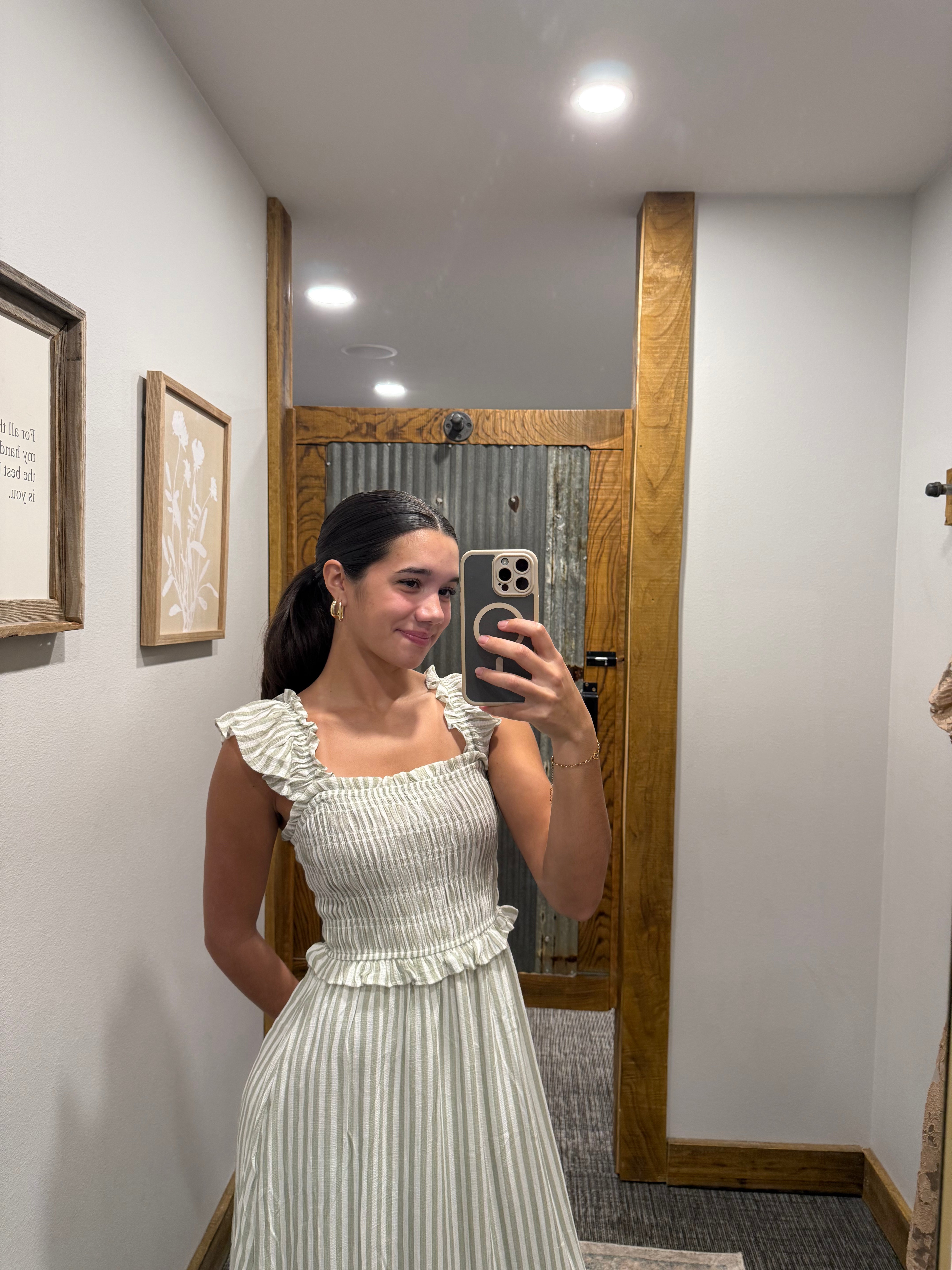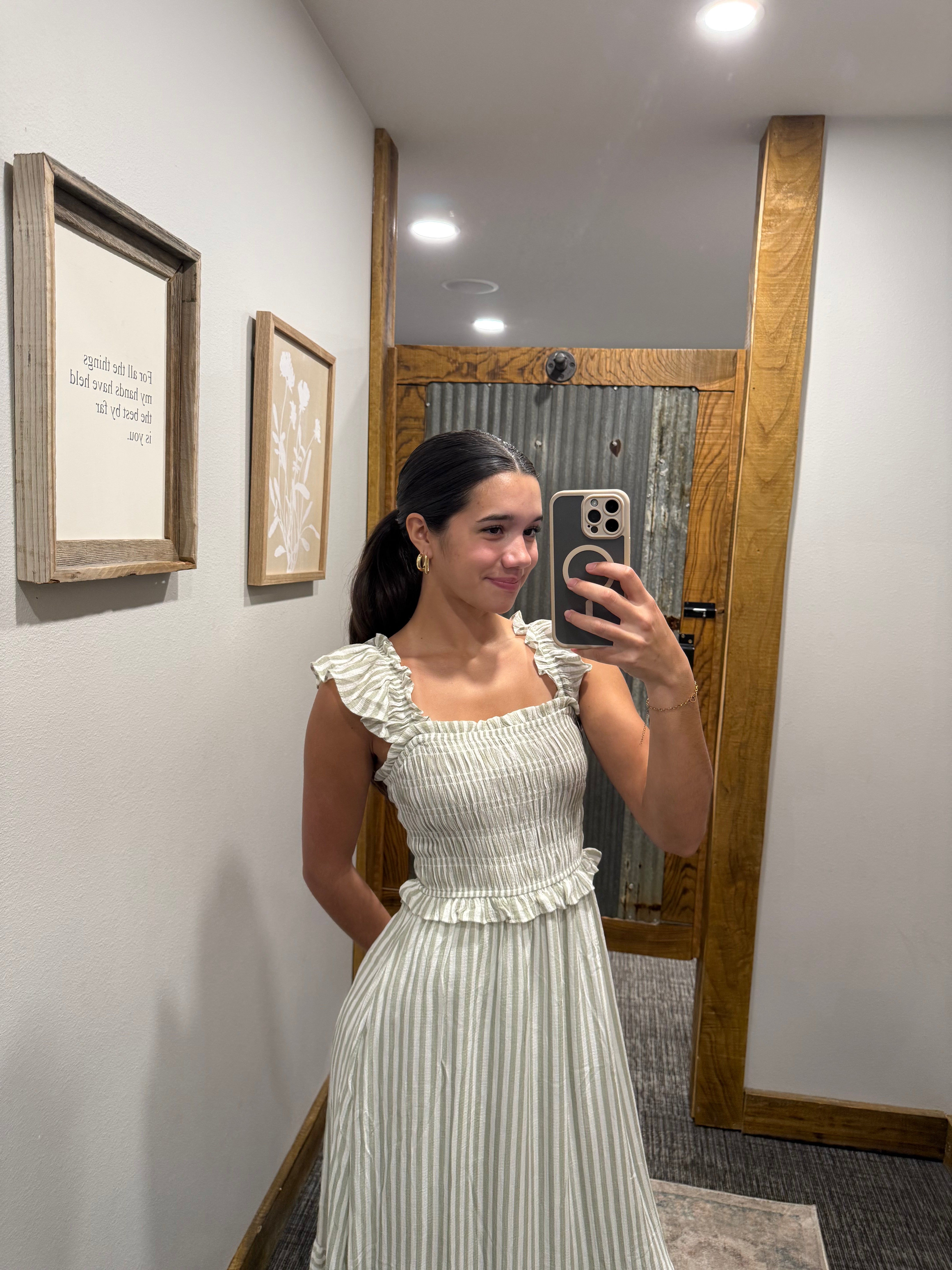 Effortless elegance meets playful charm in this striped midi dress. The smocked bodice creates a flattering, fitted silhouette while the delicate ruffle trim adds movement and dimension. Perfect for brunch, casual outings, or dressing up with accessories, this versatile piece transitions seamlessly from day to night. The midi length offers timeless appeal with a modern twist.